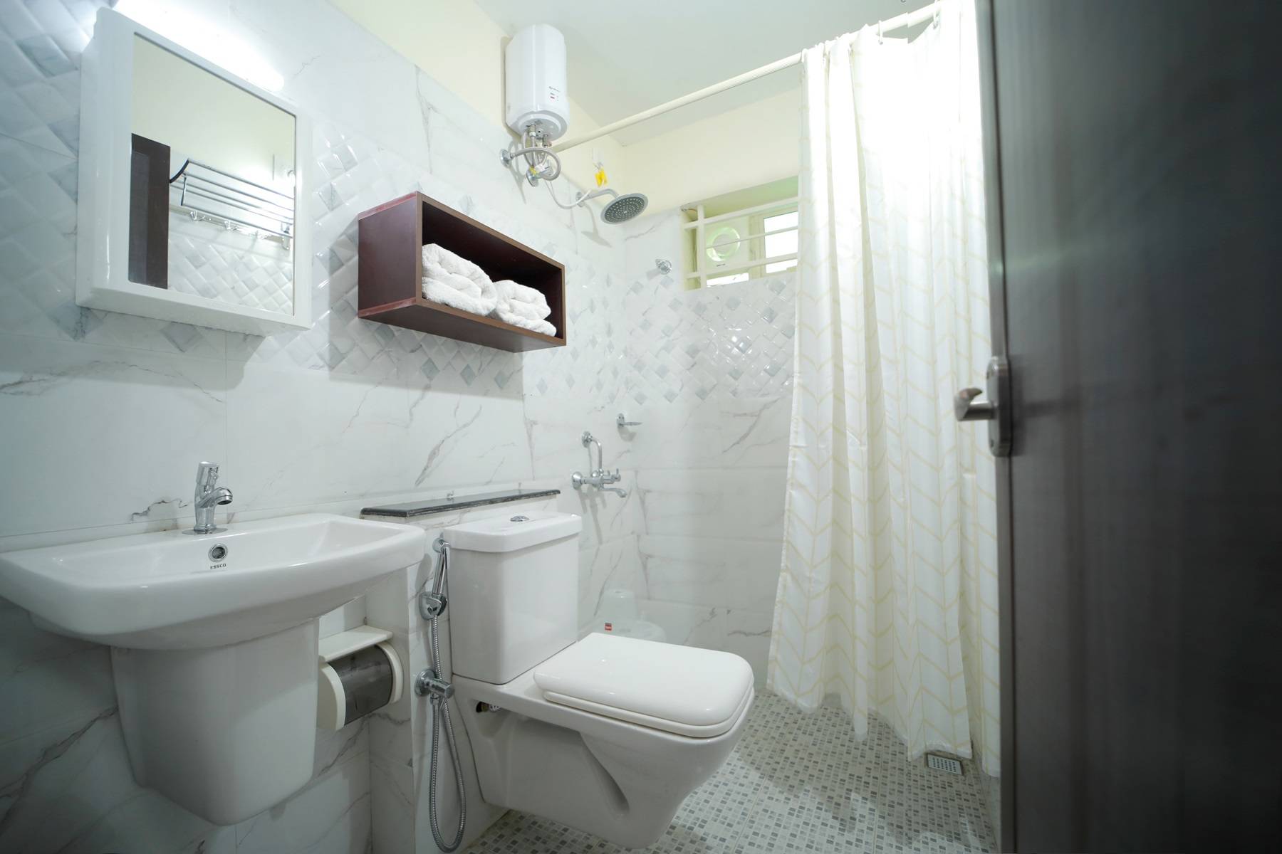 The second bathroom is ensuite, has a modern toilet and sink and a walk-in shower with water heater.
